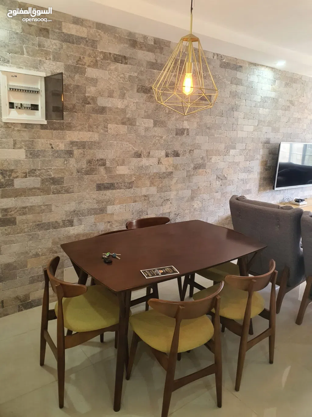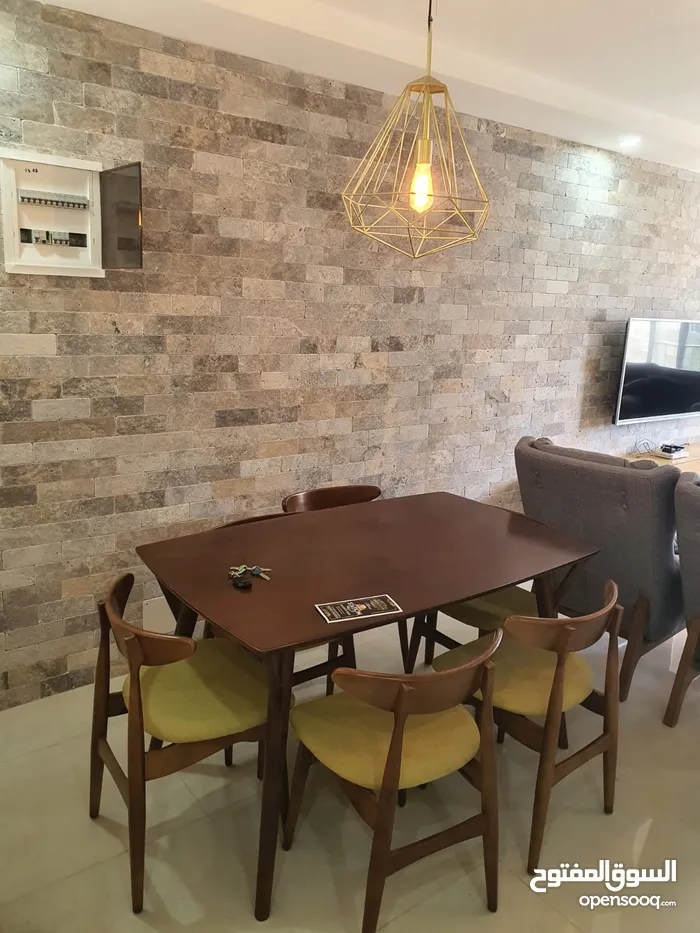 • ركن طعام أنيق بجانب جدار حجري طبيعي يمنح المكان دفئًا وملمسًا فخمًا.