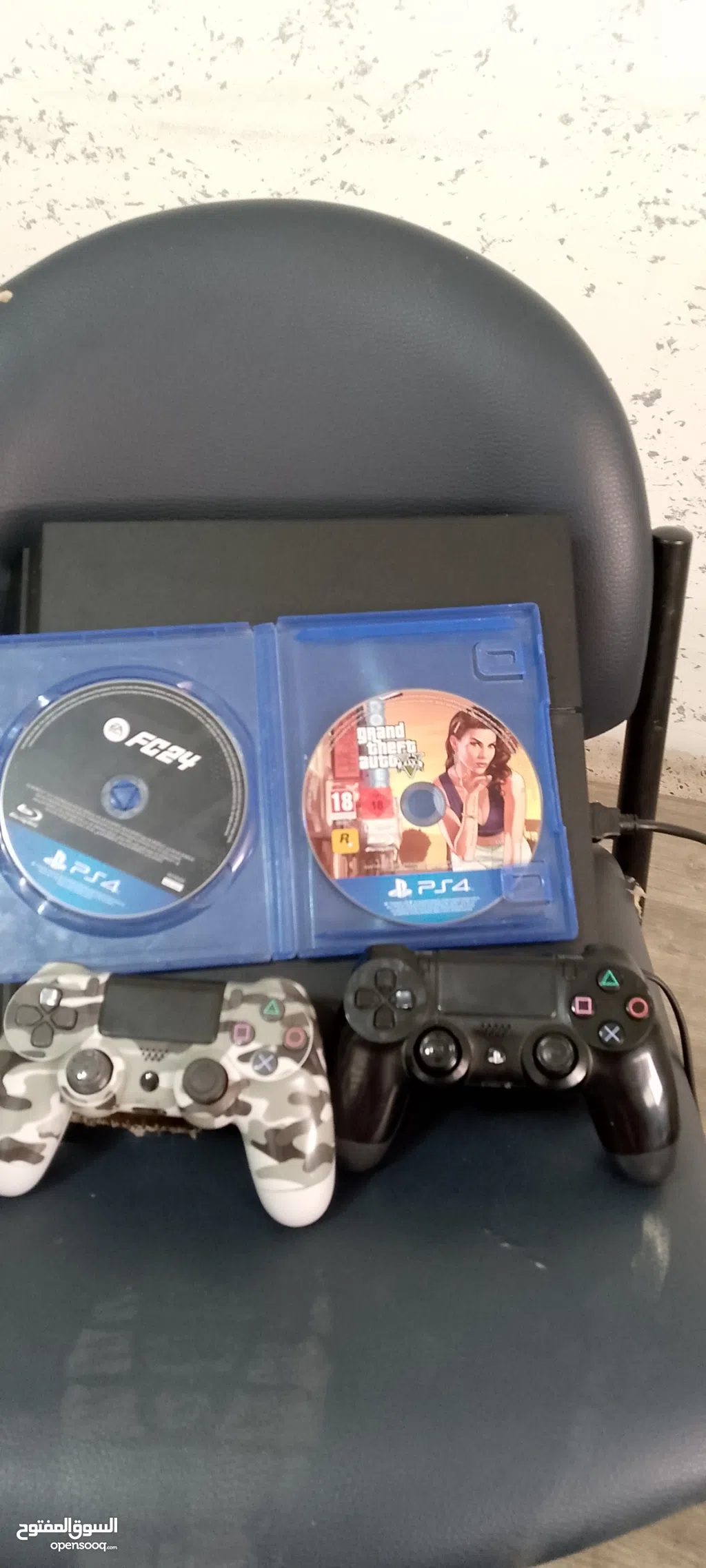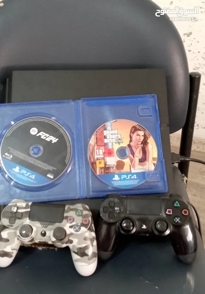 بلايستيشن 4 فات مع ايتدين تحكم اصلي وكوبي ون ودسكين جتا 5 وفيفا 24 ومع جميع كوابلة وقاعدة شحن