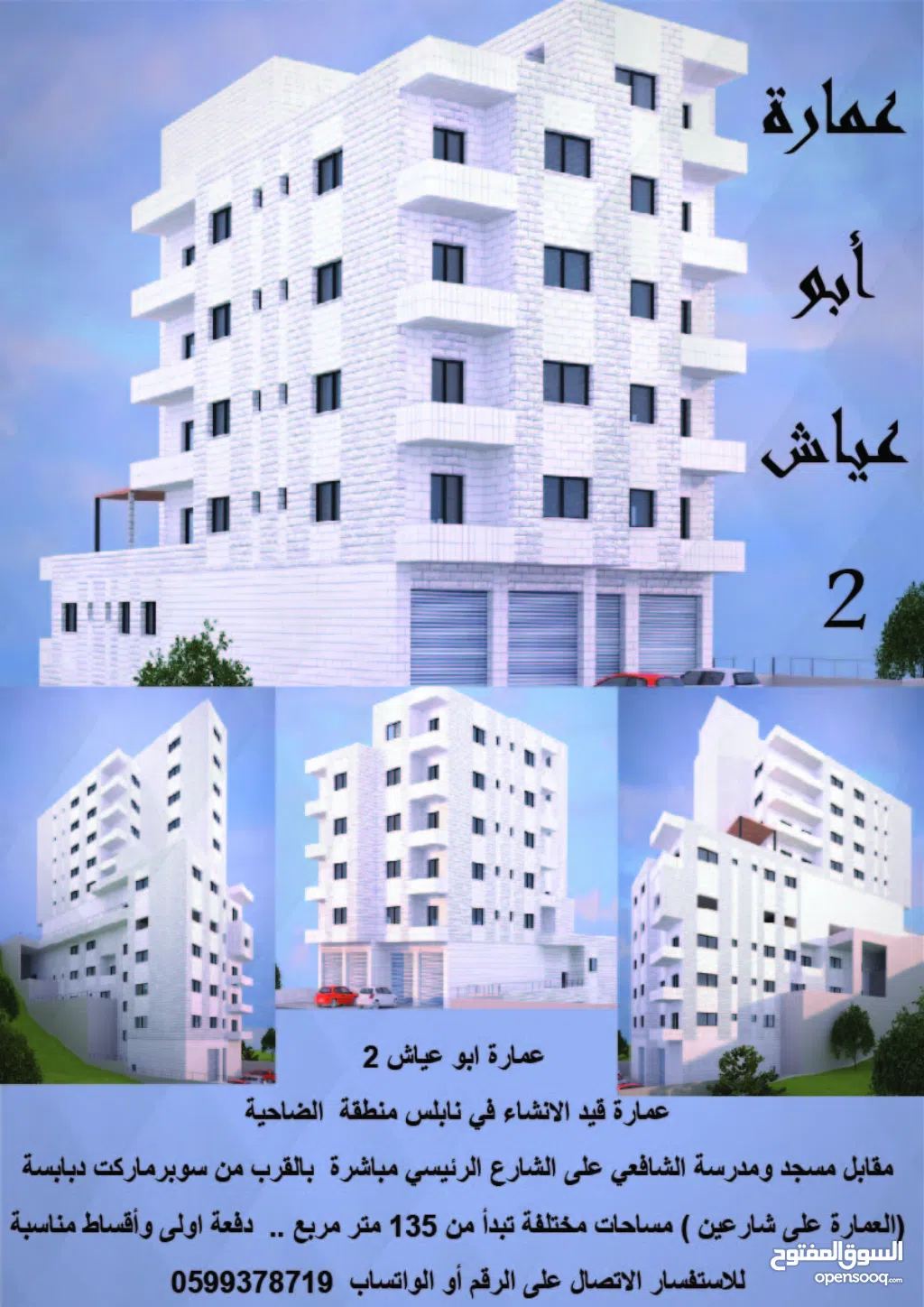 عمارة قيد الانشاء في نابلس منطقة الضاحية مقابل مسجد ومدرسة الشافعي على الشارع الرئيسي مباشرة بالقرب من سوبرماركت دبابسة ( العمارة على شارعين ) مساحات مختلفة تبدأ من 135 متر مربع .. دفعة اولى وأقساط مناسبة