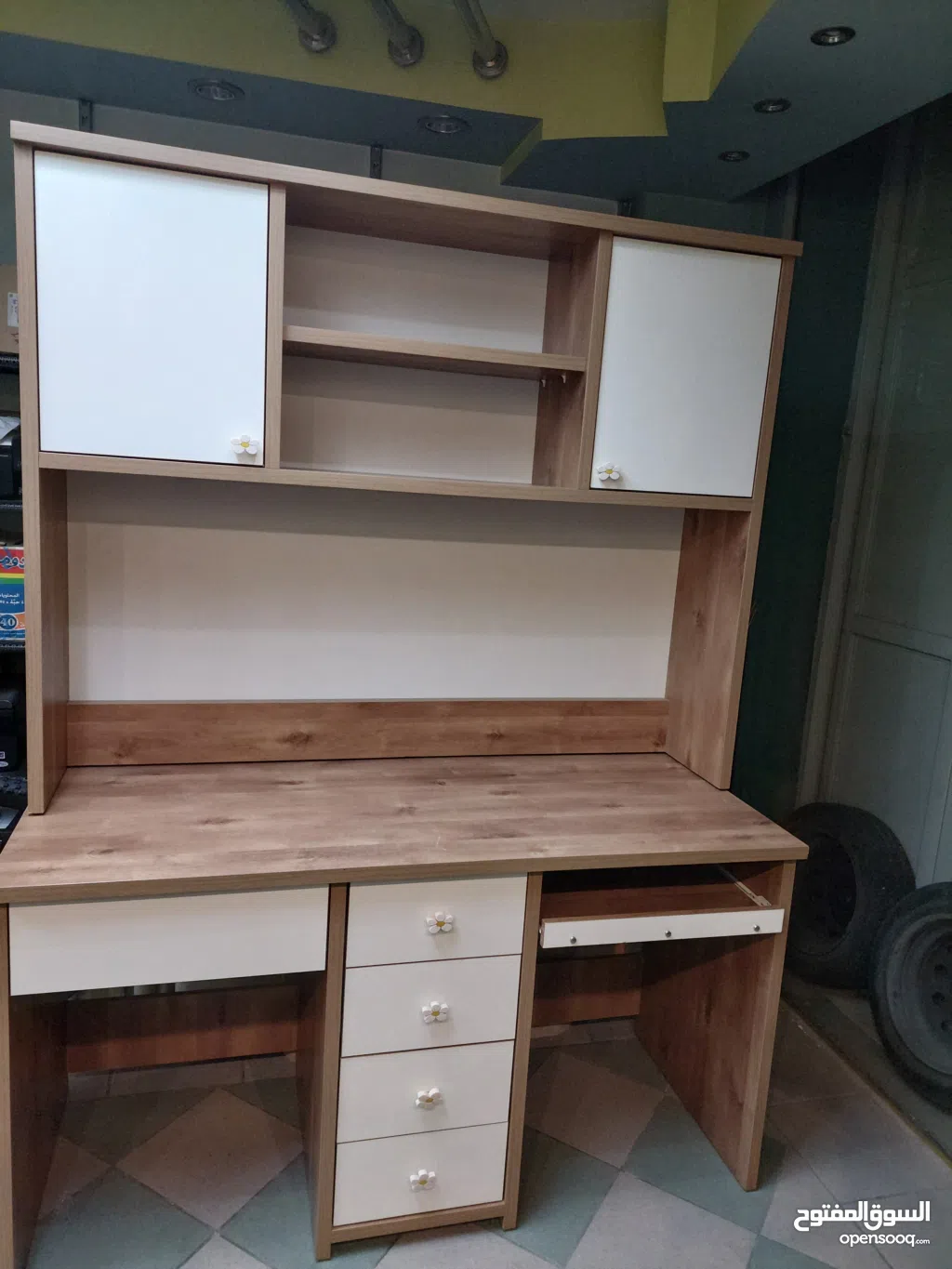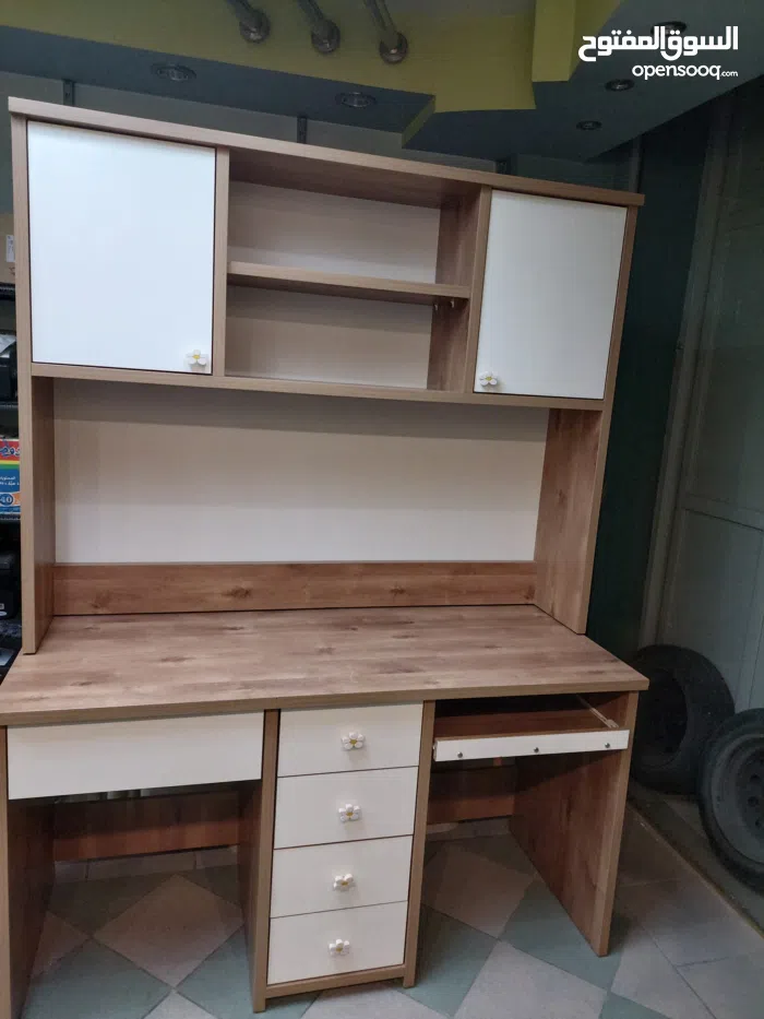 للبيع مكتب مع اربع جوارير لشخصين يصلح للدراسة ومخصص ايضال ضع كمبيوتر عليه مع خزائن ورفوف علوية