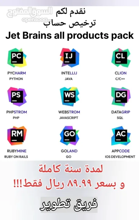 نقوم بتفعيل اشتراك JetBrains All Pack على حسابك خلال 15-30 دقيقة - نوفر الوصول إلى جميع بيئات التطوير (IDE) لمدة سنة كاملة بسعر 89.99 ريال سعودي فقط.