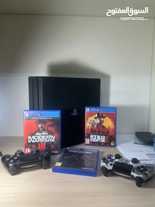 بلاستيشن 4 برو بحالة جيدة جداً شغال وبشكل منيح مع اسلاكه وثنين كنترولرز وثلاث العاب