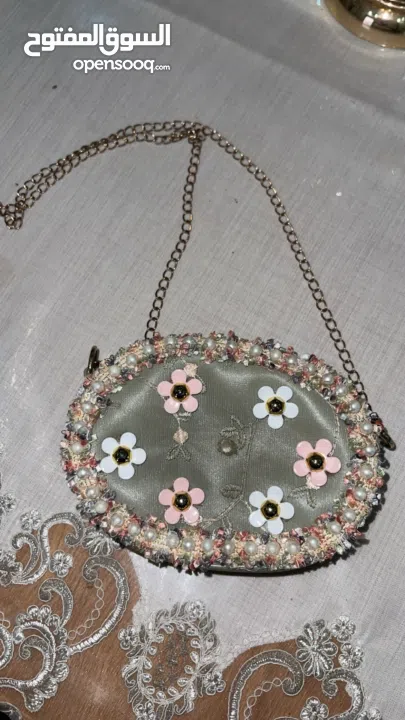 شنطة كتف لون زيتي مع ورود زهرية وبيضاء – مستعملة بحالة جيدة