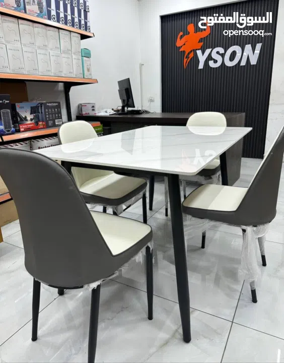 امنحي مساحتك دفعة من الرقي مع هذا الطقم العصري الذي يجمع بين طاولة بسطح رخامي لامع بأطراف هندسية ناعمة، وأربع كراسي بتصميم فاخر يجمع بين الراحة وا