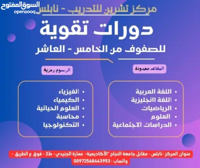 دورات التقوية للصفوف من الخامس وحتى التوجيهي (كافة الفروع) في المواد التالية:
