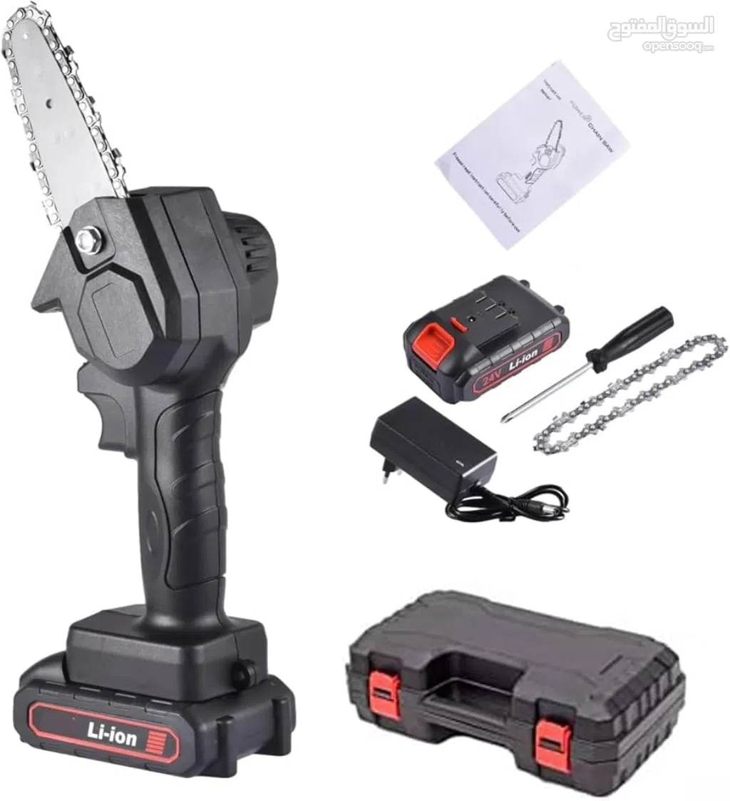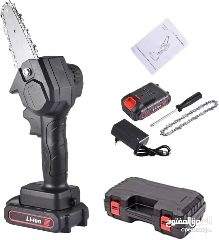 -يأتي بصندوق يشمل(منشار + بطارية + شاحن + جنزير + مفتاح + مفك + كتالوج)