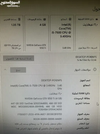 Intel Core i5-9400F كرت الشاشة: NVIDIA GTX 1060 6GB الرام: 16GB DDR4 2666MHz التخزين: SSD 128GB