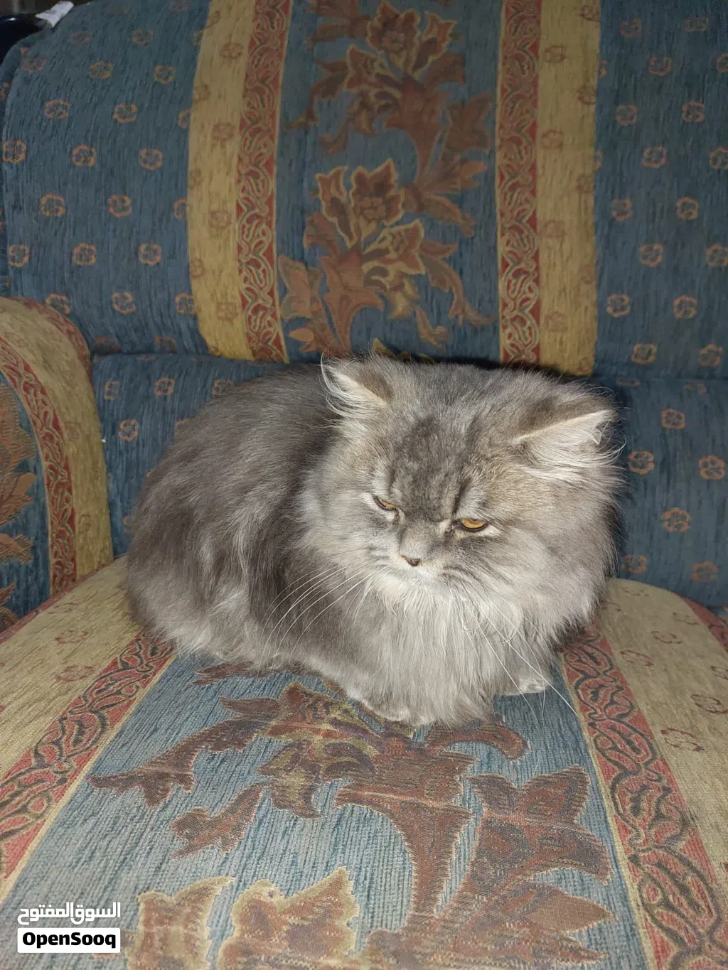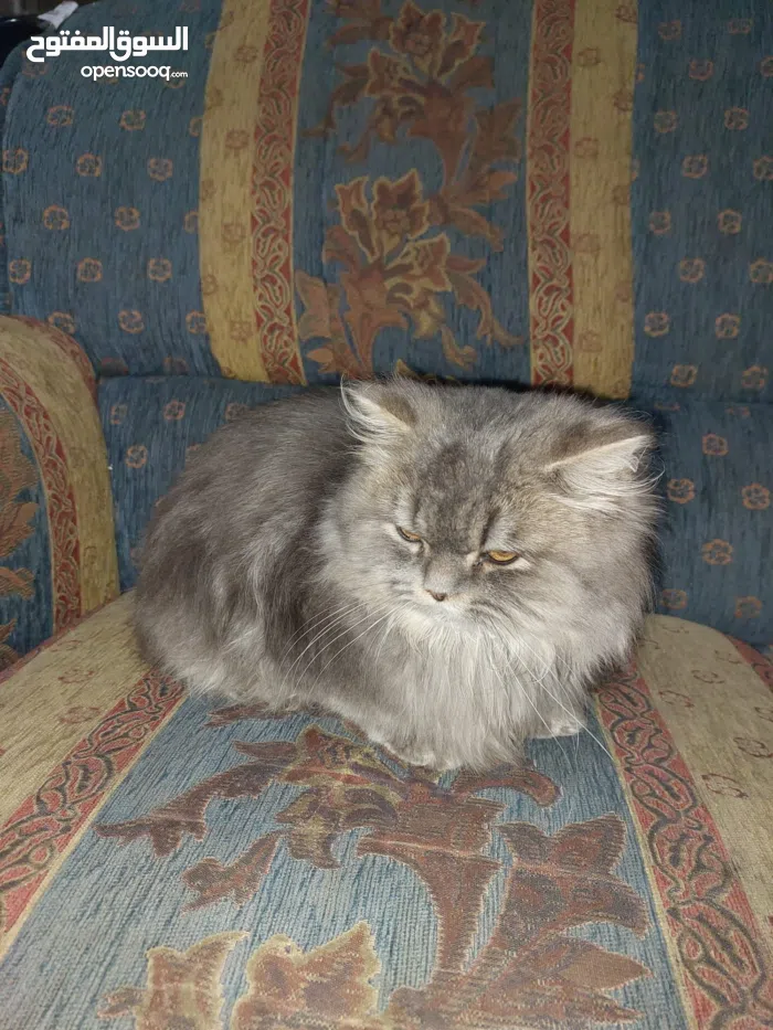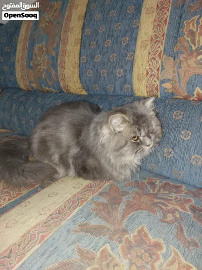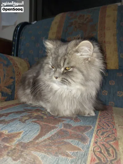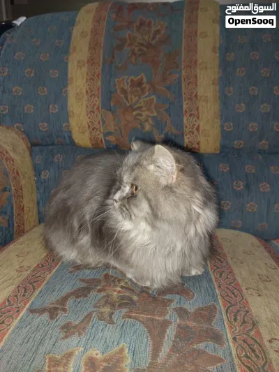 قط أليف شيرازي ذكر للبيع عمر 4 شهور، غير مطعم، صحي وما عنده أي أمراض، فروه كثيف ومرتب ولونه رمادي مميز،