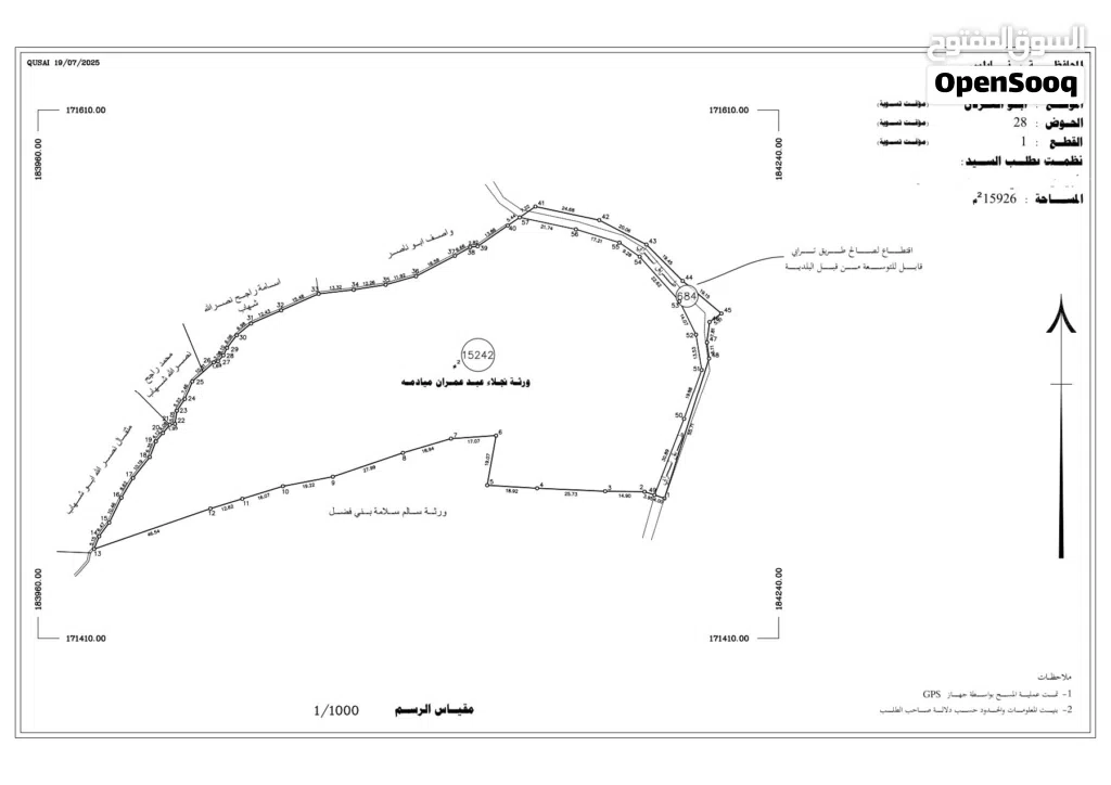 مساحة الأرض : 7 دونم (7077 متر مربع)