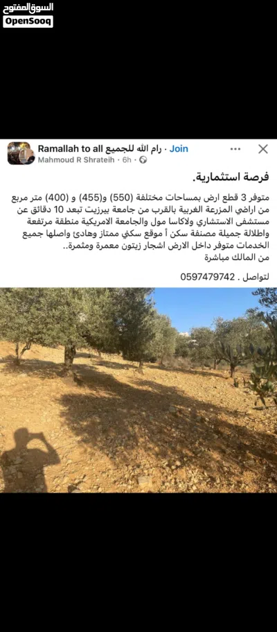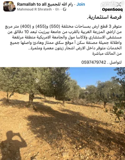 متوفر 3 قطع ارض بمساحات مختلفة (550) و(455) و (400) متر مربع من اراضي المزرعة الغربية بالقرب من الخدمات العامة منطقة مرتفعة واطلالة جميلة مصنفة سكن أ موقع سكني ممتاز وهادئ واصلها جميع الخدمات متوفر داخل الارض اشجار زيتون معمرة ومثمرة..