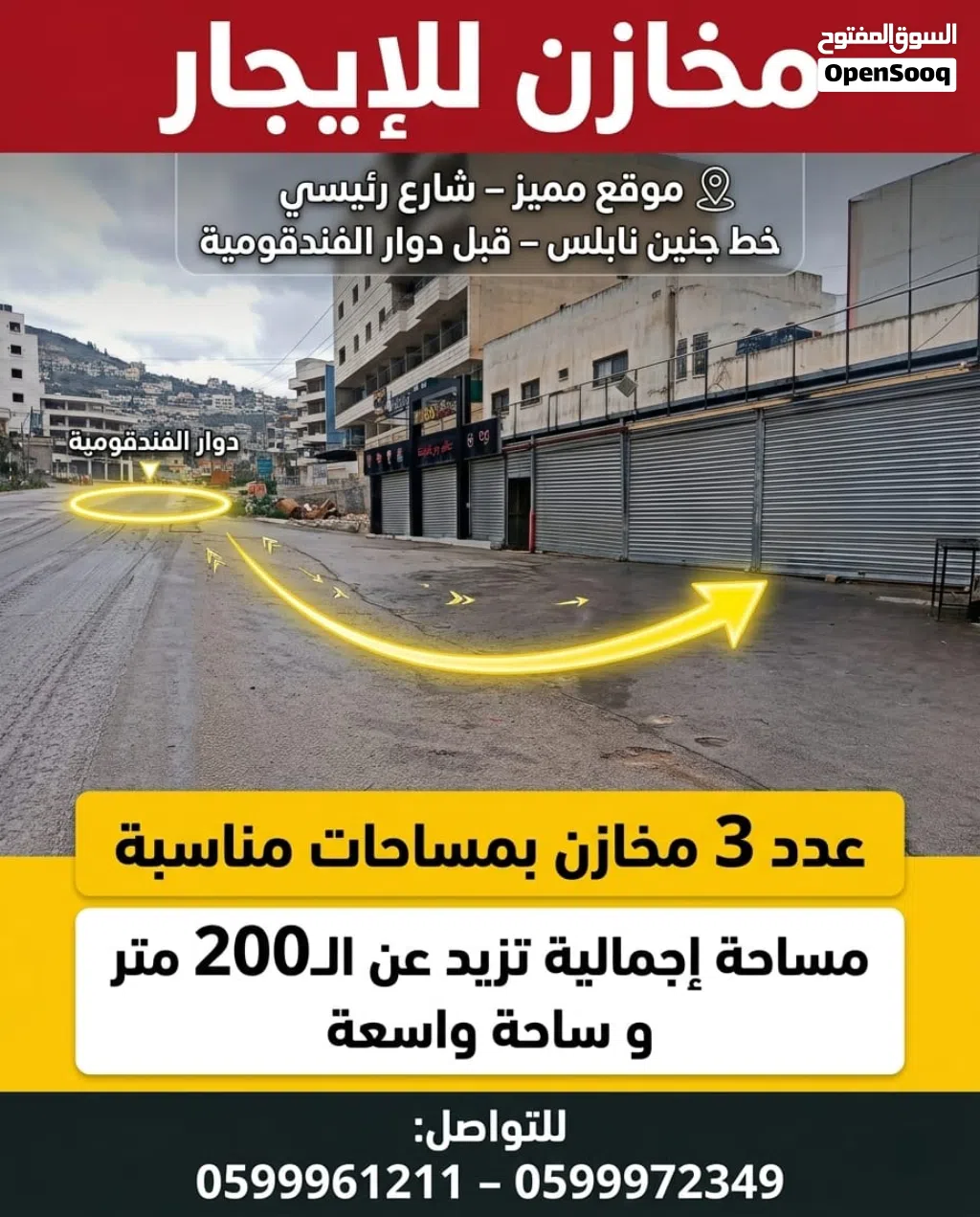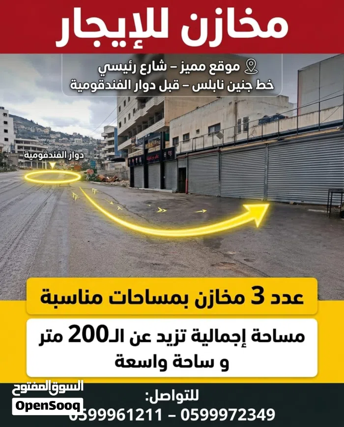 3 مخازن على الشارع الرئيسي جنين نابلس بموقع حيوي مع ساحه واسعه بالقرب من دوار الفندقوميه