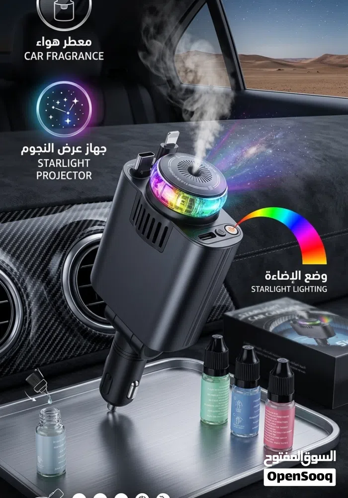 جهاز "Starlight" مش مجرد شاحن، هو نظام كامل لراحة ورفاهية سيارتك. بيجمع بين الشحن القوي وبين الأجواء الرومانسية والروائح المنعشة.