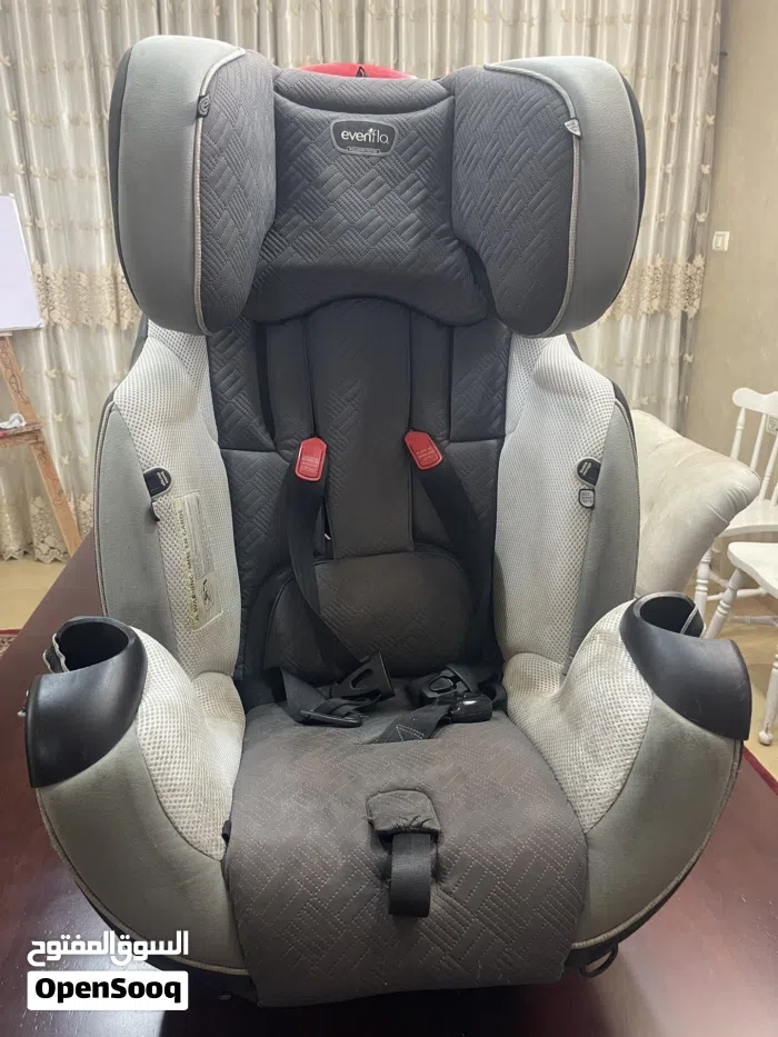 مقعد سيارة أطفال من Evenflo بحالة جيدة جداً، لون رمادي وأسود، مزود بحزام أمان 5 نقاط، مساند رأس جانبية، وحاملين للأكواب. مناسب للأطفال بمراحل عمرية مختلفة وقابل للتعديل