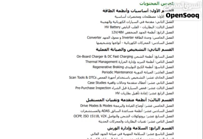 شرح أنظمة السيارات الكهربائية والهجينة، تشخيص الأعطال، التعامل مع بطاريات الليثيوم وأنظمة الجهد العالي، استخدام أجهزة OBD، والصيانة الوقائية.