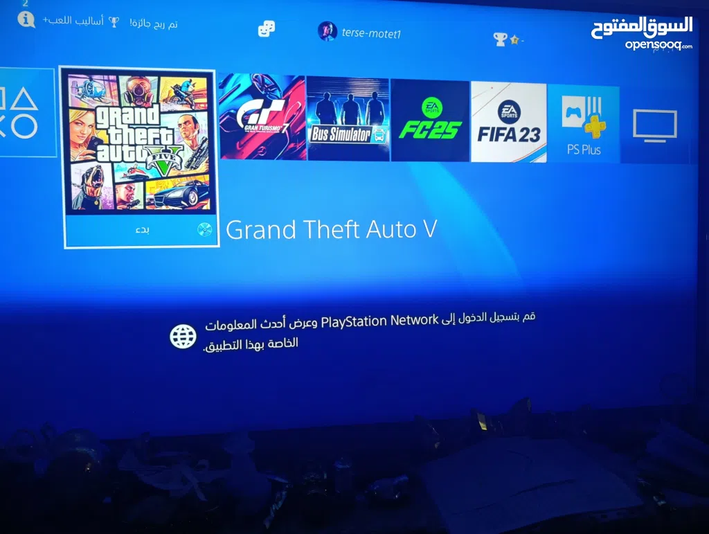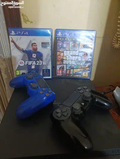 بلستيشن 4سليم مستعمل مع ايديتين اصليه ولعبتين سيدي أو اقراص والعاب تنزيل لعبه جي تي اي 5 و فيفا 25 و