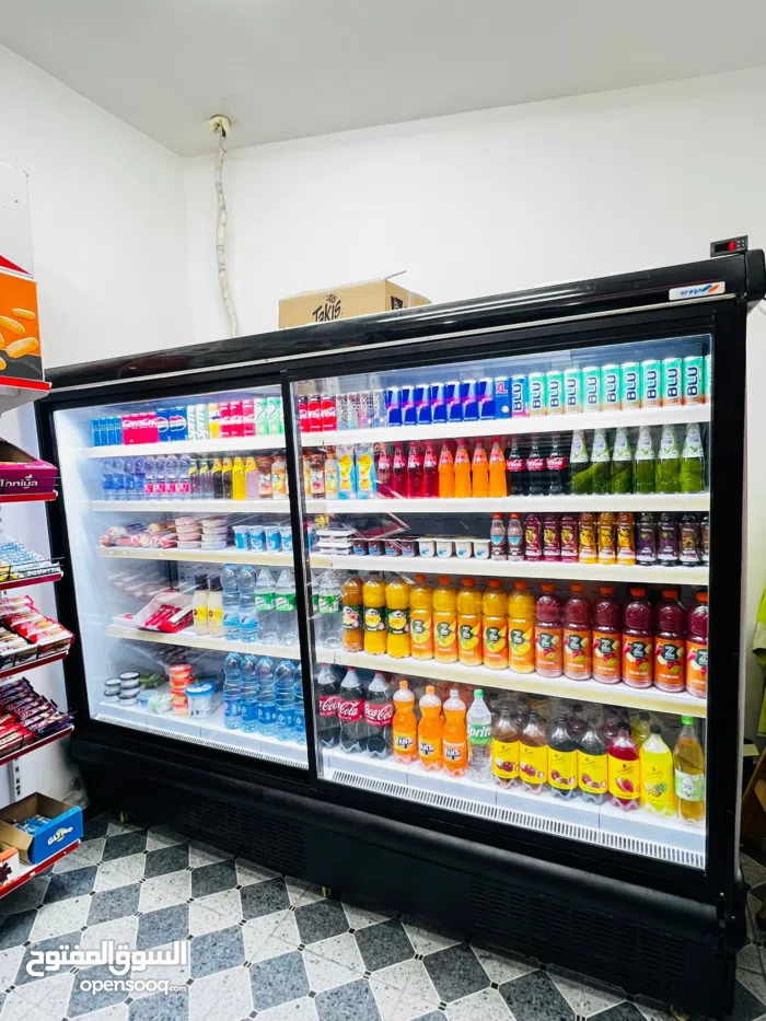 ثلاجة عرض ايطالي معها وحدة مزقان خارجي راكب عليها موفرة للكهرباء كلها زجاج وجنبها زجاج اضاءة مرتبة