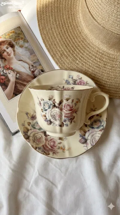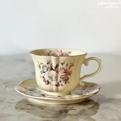 كوب أنيق بطابع كلاسيكي vintage، مزين برسومات زهور وردية وزرقاء ناعمة بتفاصيل دقيقة، مع صحن مطابق، مع حواف مزخرفة بخط ذهبي رفيع.