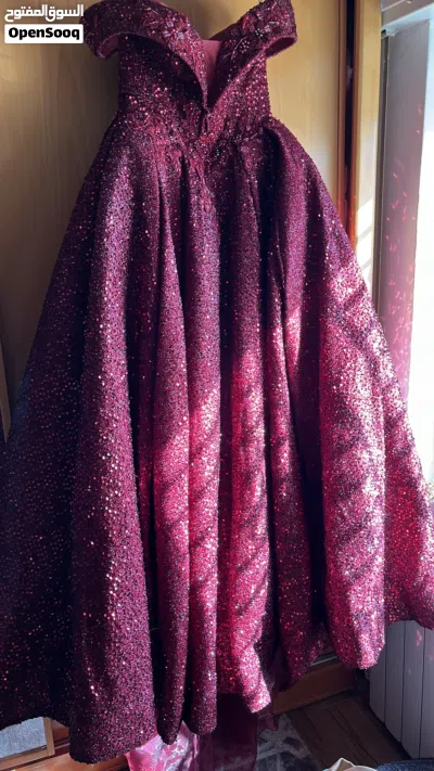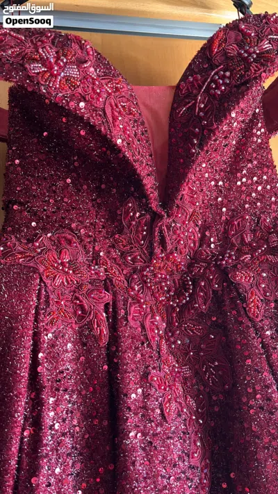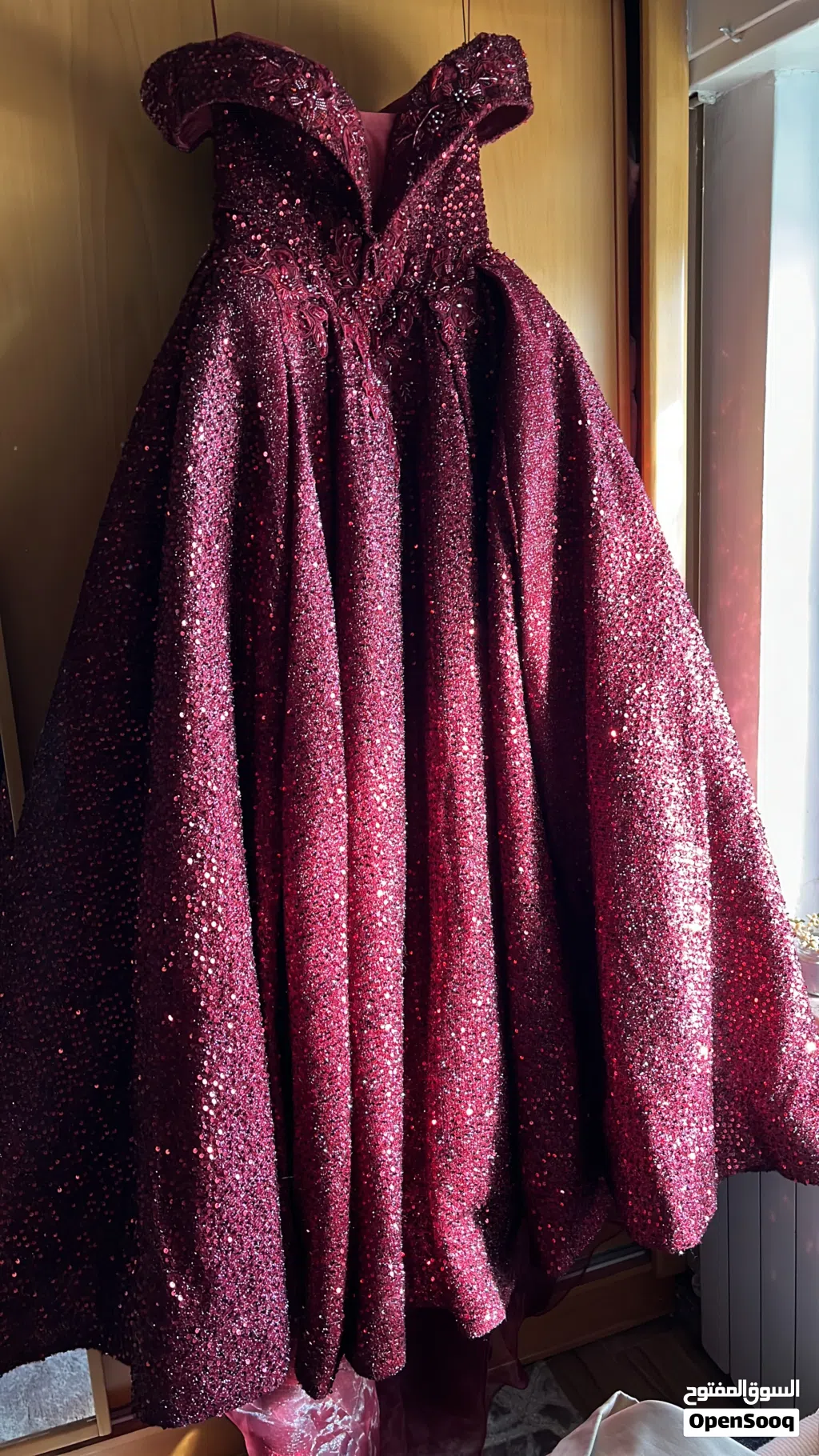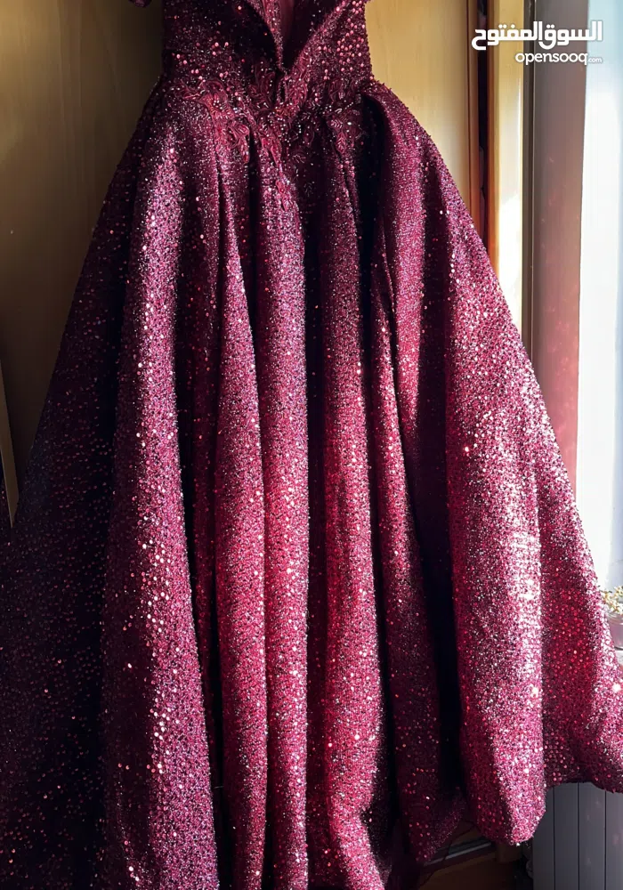 بدلة خطوبة للبيع بتلبس نمر مختلفة ويوجد رباط من الخلف موديل اوف شولدر ومعه نفاش لون خمري (برجندي) للبيع 500 شيكل فقط