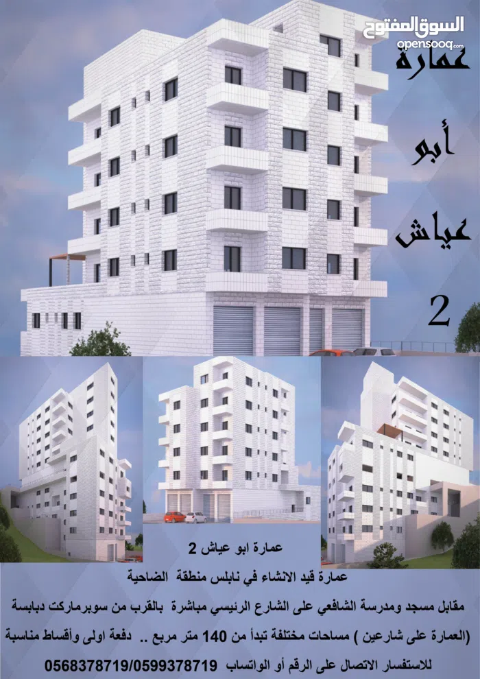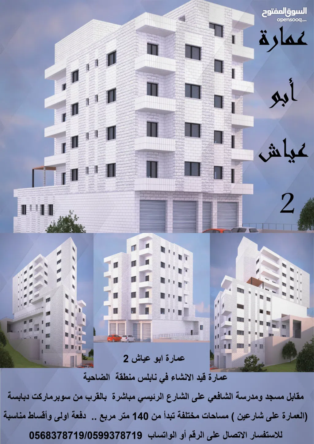 عمارة قيد الانشاء في نابلس منطقة الضاحية مقابل مسجد ومدرسة الشافعي على الشارع الرئيسي مباشرة بالقرب من سوبرماركت دبابسة ( العمارة على شارعين ) مساحات مختلفة تبدأ من 140 متر مربع .. دفعة اولى وأقساط مناسبة