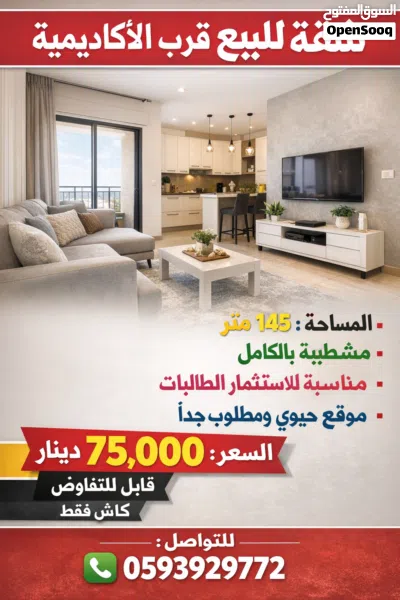 شقة تشطيب مميز 140 متر قرب الاكادمية الجامعة تصلح استثمار طالبات