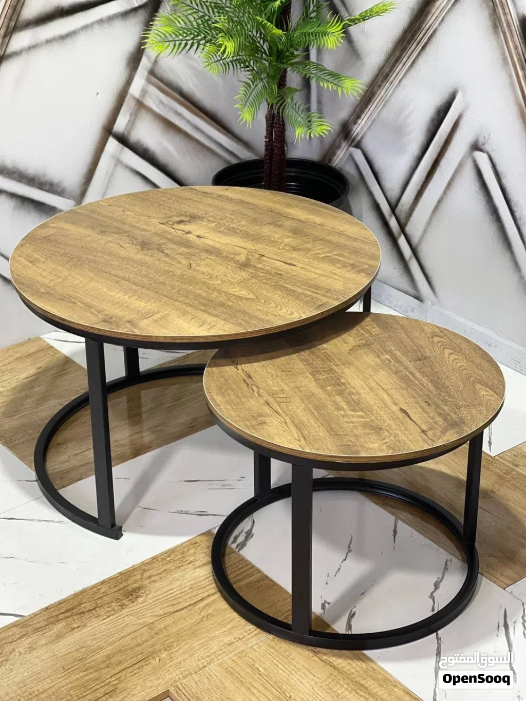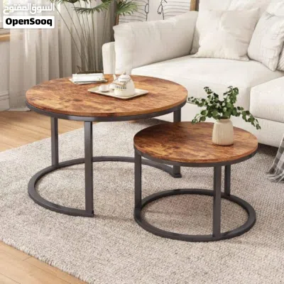 طاولتان# بتصميم دائري# عصري# من خشب# الجوز، تتداخل بسهولة لتوفير المساحة وتضيف دفء وفخامة لأي غرفة.