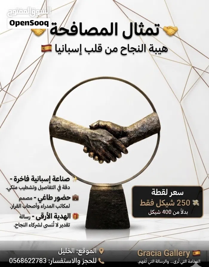 تمثال "المصافحة" من غراسيا غالري الإسبانية، قطعة فنية تُجسد الثقة، الالتزام، وبداية الشراكات الكبرى.