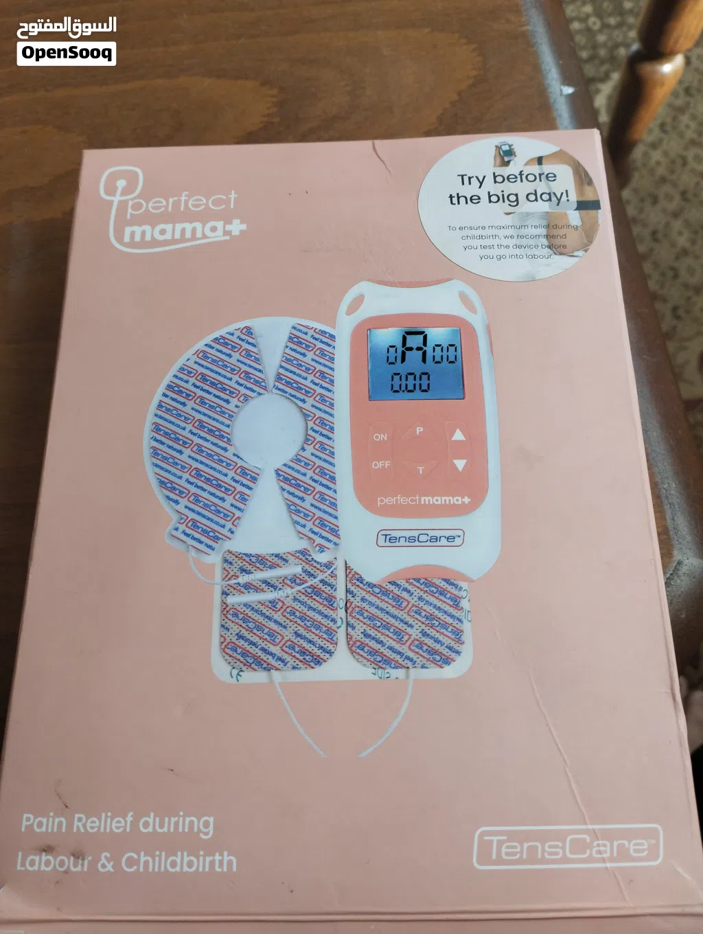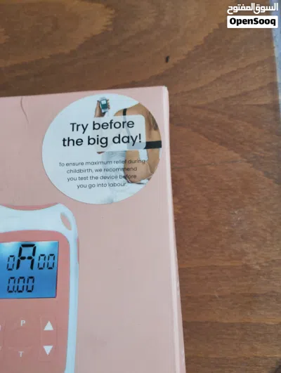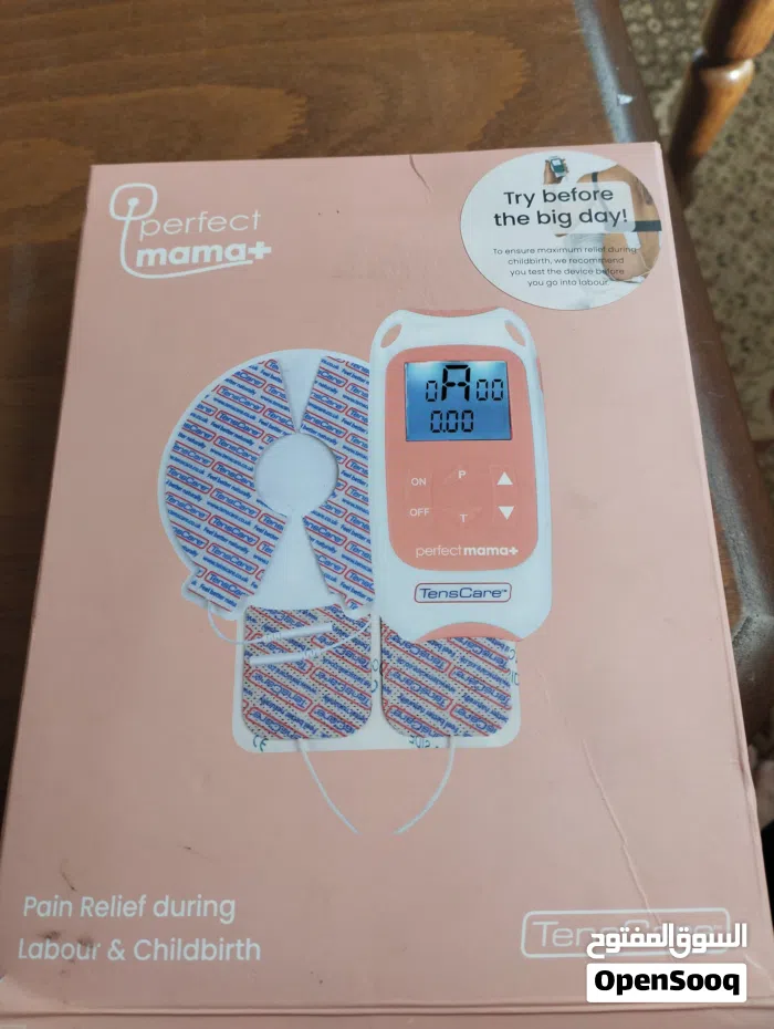 الجهاز الموضح في الصورة هو Perfect Mama+ من شركة TensCare، وهو جهاز TENS (التحفيز الكهربائي للعصب عبر الجلد) مصمم خصيصاً لتخفيف آلام المخاض والولادة بدون أدوية.